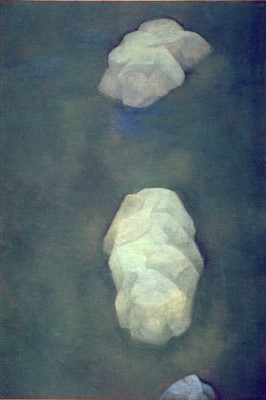 苔むした庭に3個の石だけを縦に並べています。遙邨は「この絵を描くため、いろいろな石を約千枚もスケッチした。そうしたら、その辺の家まで石に見えてきた。結局、どの石ということでなく、自分のイメージによる石になったが、石も生きているという感じがつくづくした」と語っています。