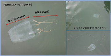 傘が3cm程、触手が20cm程の小型の種で、活動期は6月〜8月か9月とされていますが、目撃したクラゲは、傘、触手とも大きな個体でした。