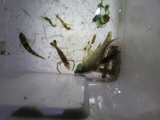 多数見られた動物はマハゼ、チチブ、手長エビ、アカデガニ、ヌマエビ、ビリンゴとヒメハゼもいたが数が捕れない。カワアナゴも一匹いたが捕れなかった。中層を泳ぐ魚もいたが捕獲が難しく、銀ブナを一匹捕えた。