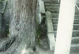 太い根の隆起により根元周辺の参道石段は著しく盛り上がり、鳥居・狛犬等造物にも僅かですが傾き等の影響が出ています。