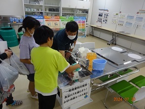 食品ロス対策として、水切り体験、水切り啓発動画の上映、食品ロス啓発資料配布(水切りネット、リーフレット、くらいふ通信等)、生ごみ処理容器展示を行い、水切り体験は子どもたちに大人気でした。